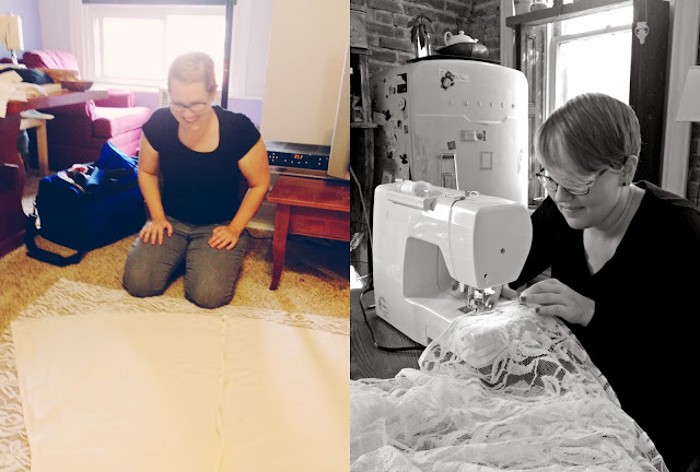She was all over it! She was excited to teach me and work together on it. I could not have asked a better teacher, she was patient and broke things down for me. I originally found the large chunky rose lace for $19 a yard at a local shop and fell in love but did not fall in love with the price. It was important to me to keep things as simple and low cost as possible. I searched etsy found the same lace for half the price. The under layer was a little difficult because I needed to touch and feel how it would look with the lace so we picked up a cream knit material at JoAnn's with coupons. I already had the Zipper and thread, although we used Kristin's thread more.